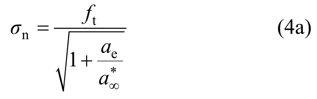 式中:σn为考虑裂缝长度影响的名义应力,对于无缝试件,σn=σN,σn相关于几何结构参数ae与峰值荷载Pmax等;ft为材料的拉伸强度;ae记为等效裂缝长度,为试件的几何结构参数,其仅与试件尺寸相关,而若对于无缝试件,ae=0;