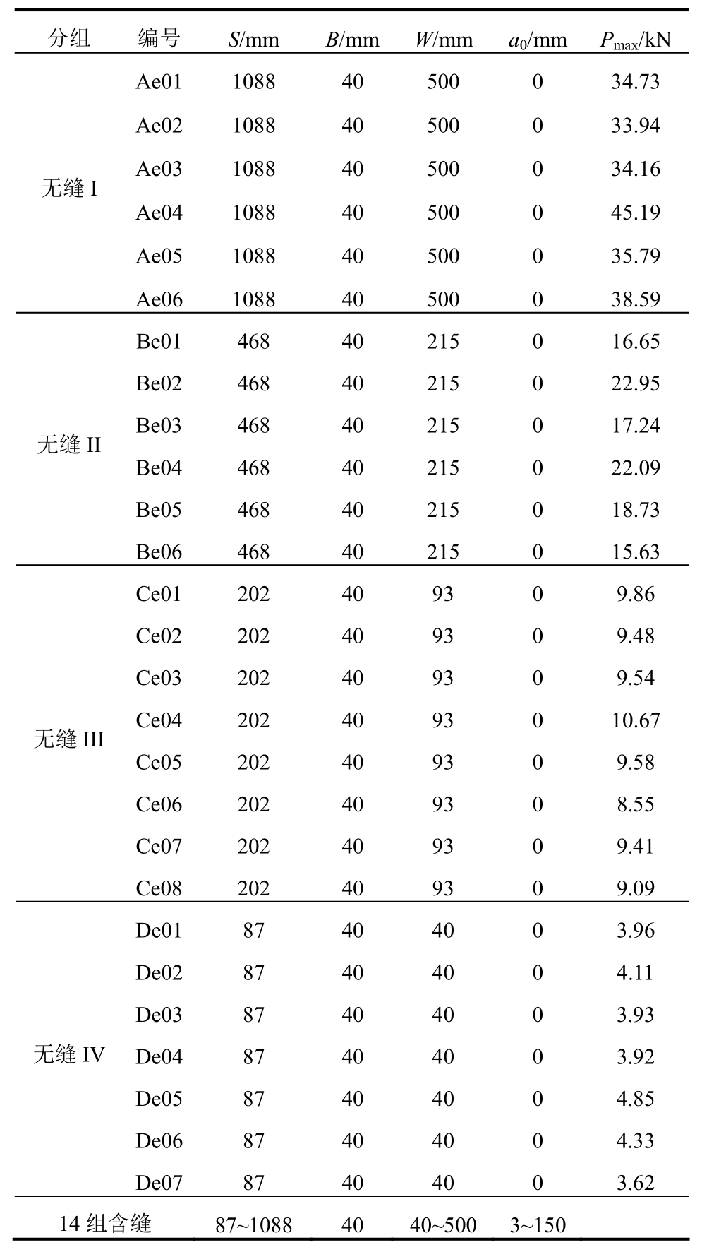 分组 编号 S/mm B/mmW/mm a0/mm Pmax/kN Ae01 1088 40 500 0 34.73无缝I Ae02 1088 40 500 0 33.94 Ae03 1088 40 500 0 34.16 Ae04 1088 40 500 0 45.19 Ae05 1088 40 500 0 35.79 Ae06 1088 40 500 0 38.59 Be01 468 40 215 0 16.65无缝II Be02 468 40 215 0 22.95 Be03 468 40 215 0 17.24 Be04 468 40 215 0 22.09 Be05 468 40 215 0 18.73 Be06 468 40 215 0 15.63 Ce01 202 40 93 0 9.86无缝III Ce02 202 40 93 0 9.48 Ce03 202 40 93 0 9.54 Ce04 202 40 93 0 10.67 Ce05 202 40 93 0 9.58 Ce06 202 40 93 0 8.55 Ce07 202 40 93 0 9.41 Ce08 202 40 93 0 9.09 De01 87 40 40 0 3.96无缝IV De02 87 40 40 0 4.11 De03 87 40 40 0 3.93 De04 87 40 40 0 3.92 De05 87 40 40 0 4.85 De06 87 40 40 0 4.33 De07 87 40 40 0 3.62 14组含缝 87~1088 40 40~500 3~150
