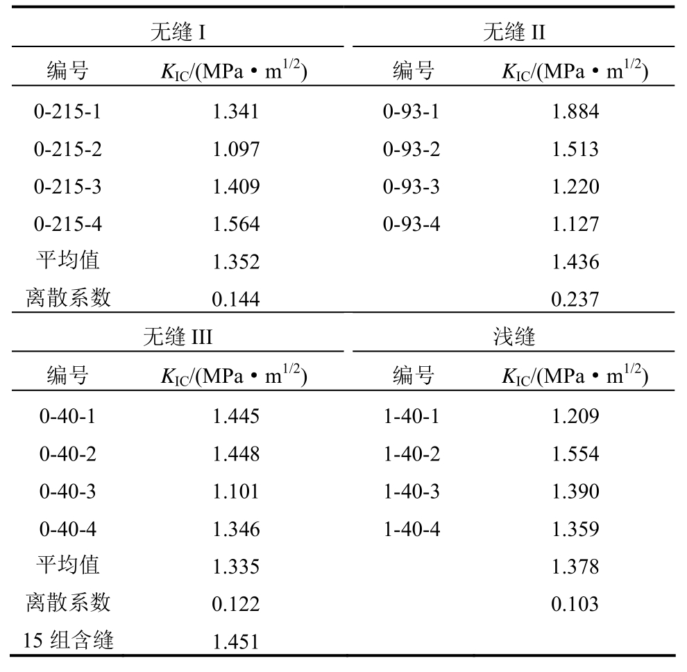无缝I 无缝II编号 KIC/(MPa·m1/2) 编号 KIC/(MPa·m1/2)0-215-1 1.341 0-93-1 1.884 0-215-2 1.097 0-93-2 1.513 0-215-3 1.409 0-93-3 1.220 0-215-4 1.564 0-93-4 1.127平均值 1.352 1.436离散系数0.144 0.237无缝III 浅缝编号 KIC/(MPa·m1/2) 编号 KIC/(MPa·m1/2)0-40-1 1.445 1-40-1 1.209 0-40-2 1.448 1-40-2 1.554 0-40-3 1.101 1-40-3 1.390 0-40-4 1.346 1-40-4 1.359平均值 1.335 1.378离散系数0.122 0.103 15组含缝1.451