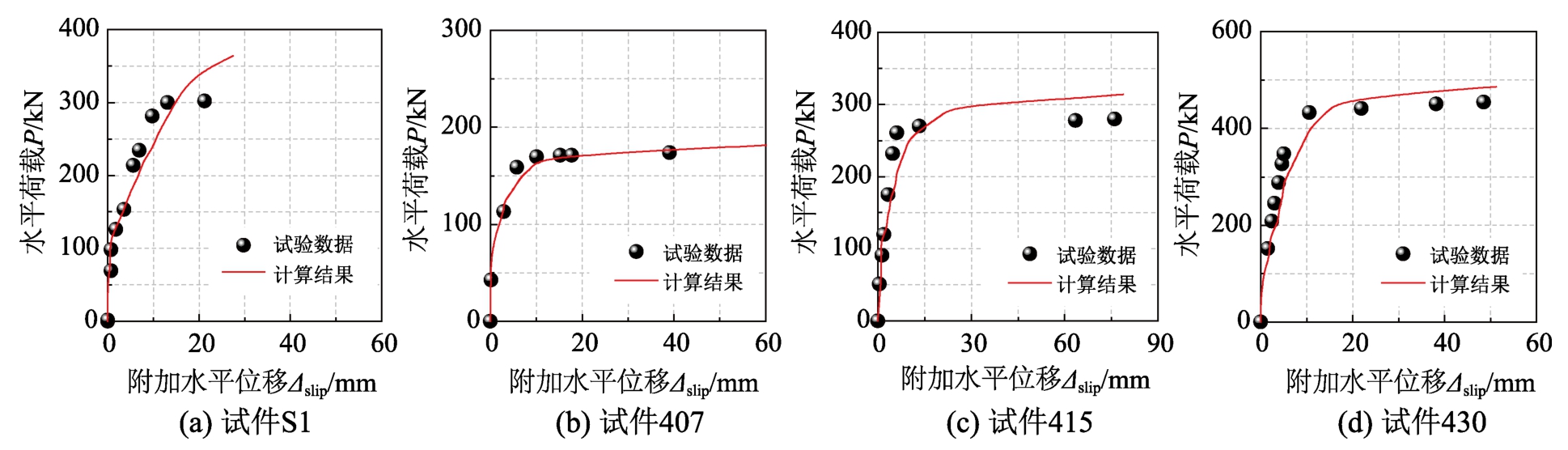 图12所示为计算的附加柱顶水平位移与试验结果的对比。在钢筋屈服前阶段,计算结果与试验数据吻合良好,随着水平荷载增加,计算结果略微低估试验结果。总体而言,由式(15)计算的附加柱顶水平位移与试验数据吻合度较好,表明模型A可反映钢筋滑移变形引起的柱顶附加水平位移。由此进一步证明了本文所提钢筋模型中通过扩大钢筋受拉状态下的应变值来反映钢筋滑移效应(截面层次)这一假设的可靠性。因此,从构件和截面层次验证了本文所提钢筋模型具有较好的精度和可靠性。