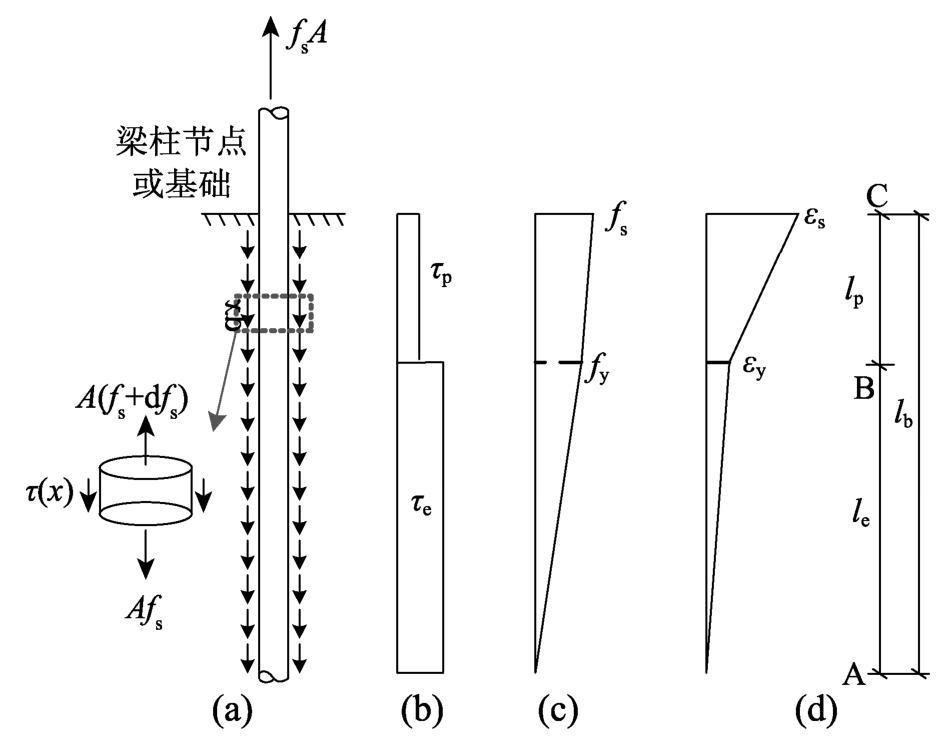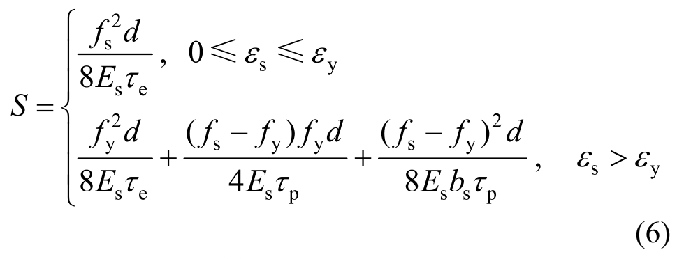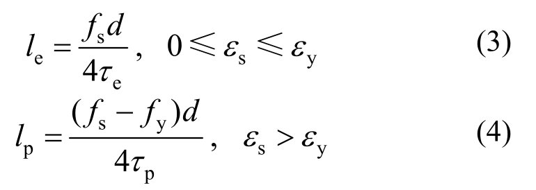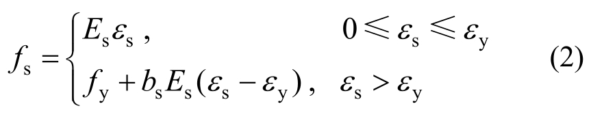 式中:Es为钢筋弹性模量;εs为钢筋应变;bs为钢筋硬化率;fy和εy分别为钢筋屈服强度和屈服应变。由式(2)可得钢筋应变沿长度lb也为双线性分布,如图1(d)所示。
