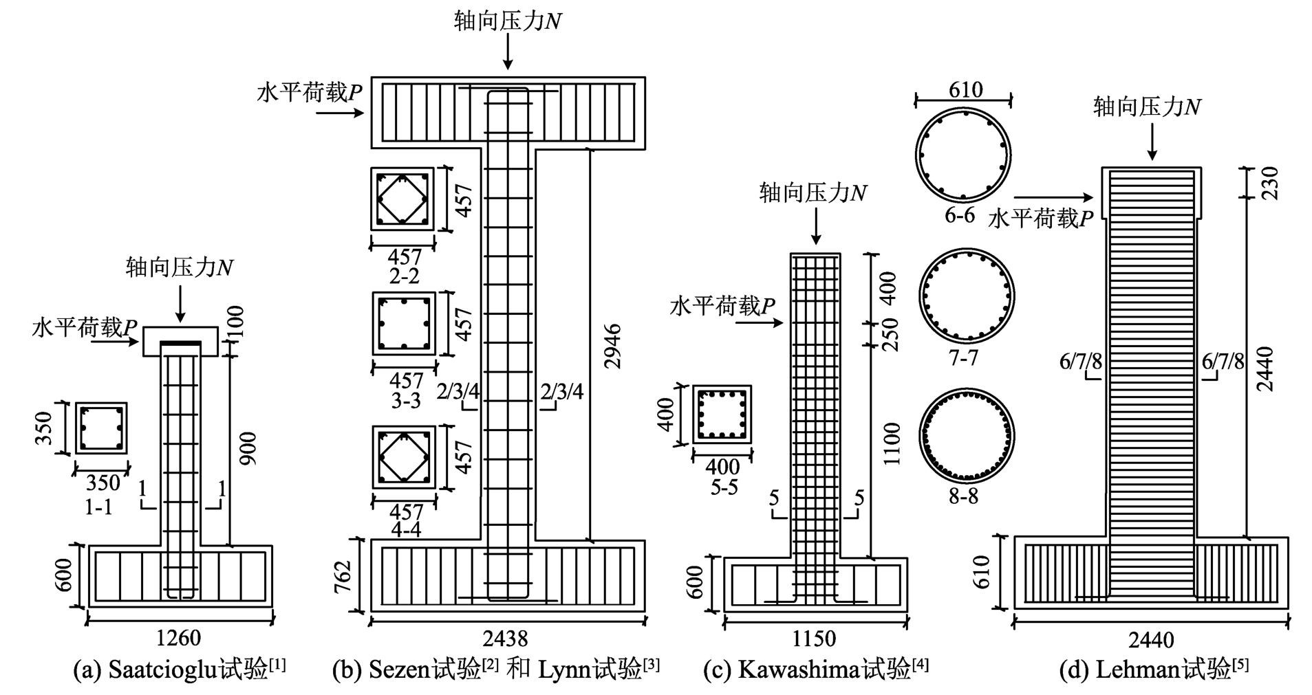 本文所述的钢筋滑移效应在以延性破坏为主的RC框架结构中更加突出,为避免尺寸效应,本文尽量选择缩尺比较大,截面尺寸较大,且破坏形态以延性破坏为主的试验资料进行验证。文献[1-5]分别对大比例尺RC框架柱和桥墩进行了拟静力试验研究,试验框架柱和桥墩的设计参数如表4所示,截面及配筋如图7所示。