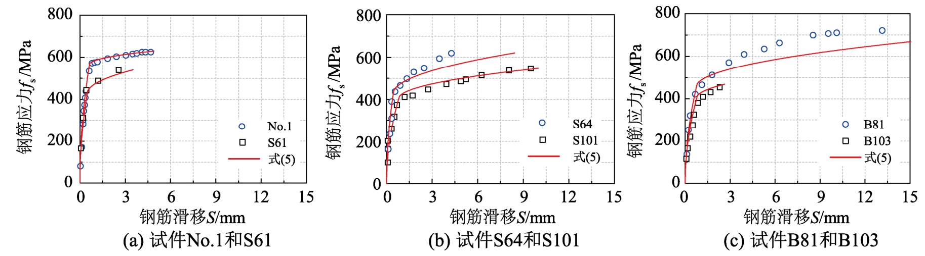如图3所示,式(5)在弹性阶段的应力-滑移曲线与拉拔试验数据吻合精度较好,在非弹性阶段,式(5)预计的钢筋滑移量稍大。总体而言,式(5)可反映钢筋弹性和非弹性变形下的滑移特征。