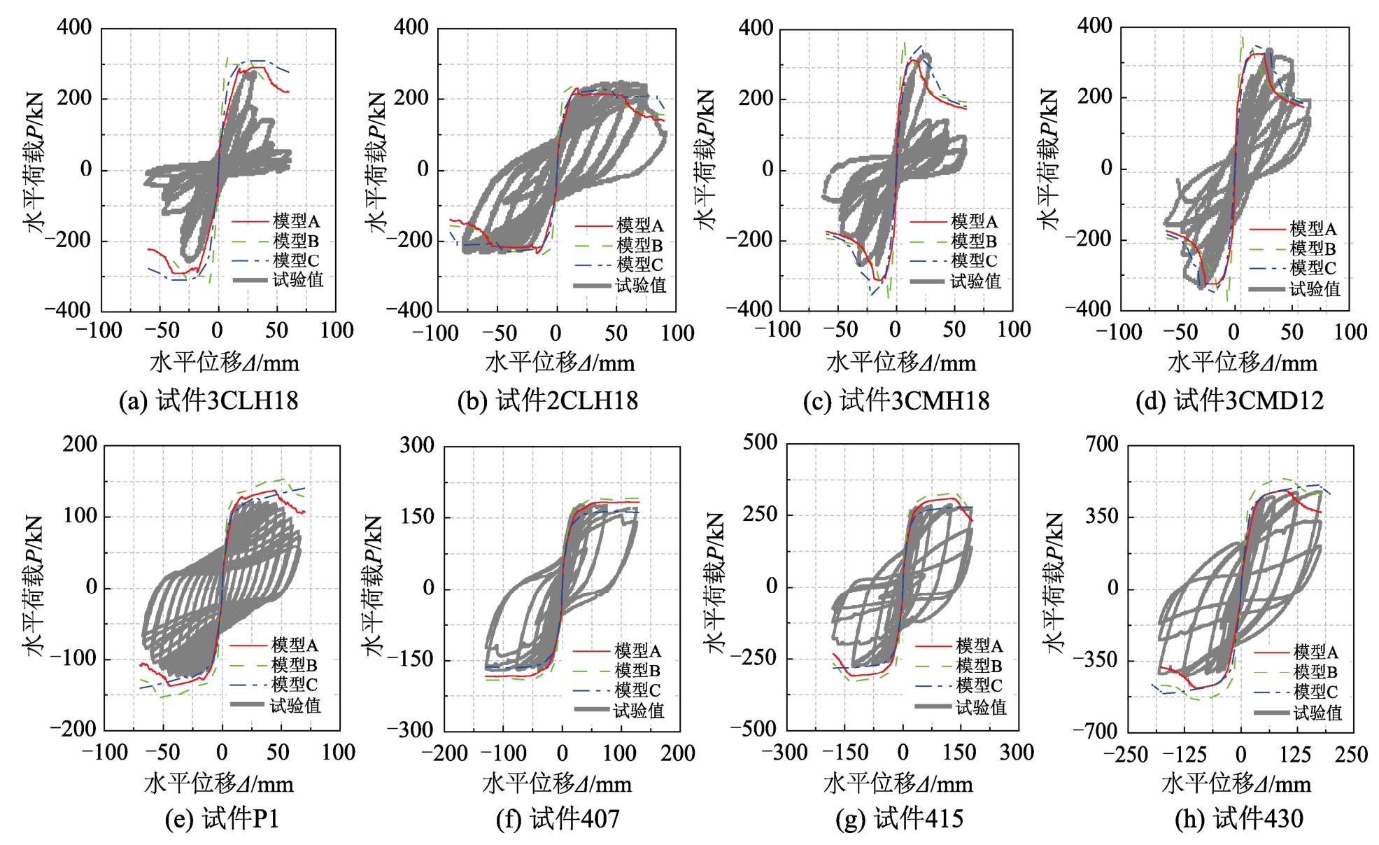 图11所示为模拟结果与Lynn、Kawashima和Lehman试验结果的对比。由图11(a)~图11(d)可看到在中小轴压比(0.07~0.26)时,模型A与模型C的计算结果与试验结果最为吻合,而模型B依然高估了柱的刚度。由图11(e)~图11(h)可看到模型A与试验结果吻合度较高,模型C次之,而模型B则高估柱的刚度。总体而言,模型A的计算结果与试验结果最为吻合,能够较好地反映RC柱承载力、刚度和位移变化。