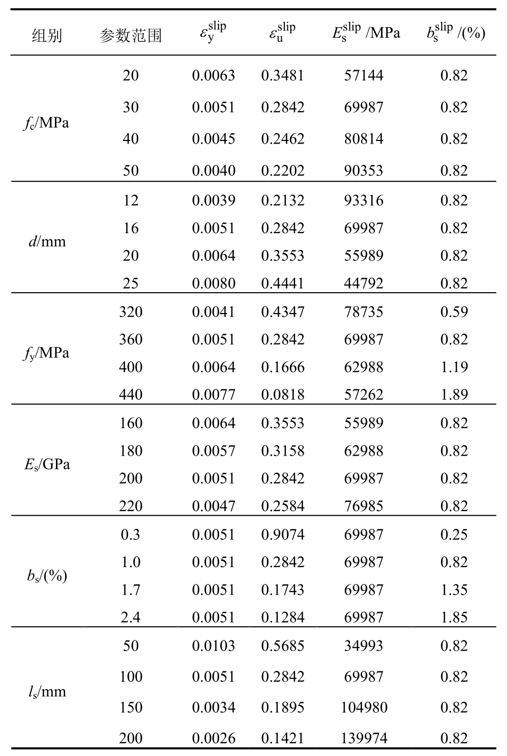 组别 参数范围 slipyε slipuε Eslips/MPa bslips/(%)20 0.0063 0.3481 57144 0.82 fc/MPa 30 0.0051 0.2842 69987 0.82 40 0.0045 0.2462 80814 0.82 50 0.0040 0.2202 90353 0.82 12 0.0039 0.2132 93316 0.82 d/mm 16 0.0051 0.2842 69987 0.82 20 0.0064 0.3553 55989 0.82 25 0.0080 0.4441 44792 0.82 320 0.0041 0.4347 78735 0.59 fy/MPa 360 0.0051 0.2842 69987 0.82 400 0.0064 0.1666 62988 1.19 440 0.0077 0.0818 57262 1.89 160 0.0064 0.3553 55989 0.82 Es/GPa 180 0.0057 0.3158 62988 0.82 200 0.0051 0.2842 69987 0.82 220 0.0047 0.2584 76985 0.82 0.3 0.0051 0.9074 69987 0.25 1.0 0.0051 0.2842 69987 0.82 1.7 0.0051 0.1743 69987 1.35 bs/(%)2.4 0.0051 0.1284 69987 1.85 50 0.0103 0.5685 34993 0.82 ls/mm 100 0.0051 0.2842 69987 0.82 150 0.0034 0.1895 104980 0.82 200 0.0026 0.1421 139974 0.82
