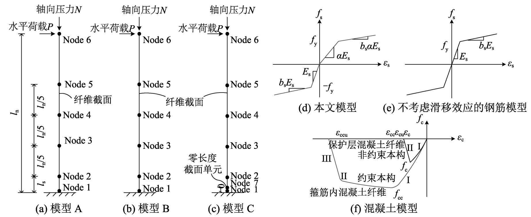 除模型C中Node 1~Node 2的构件单元采用零长度截面单元外,其他构件单元均采用基于位移法的非线性梁柱单元,以上3个模型均采用纤维截面。模型A的钢筋纤维本构关系为本文所提出的双线性钢筋模型,采用OpenSEES的Hysteretic材料模拟,如图8(d)所示;模型B的钢筋纤维本构关系为不考虑滑移效应的双线性钢筋模型,采用OpenSEES的Steel01材料模拟,如图8(e)所示。