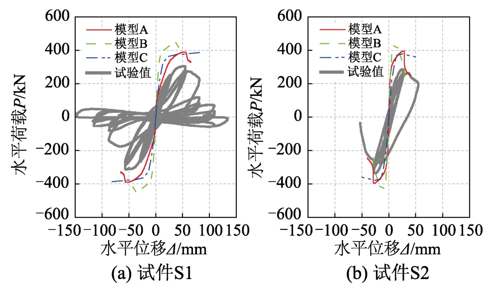 图10所示为模拟结果与Sezen试验结果的对比。由图10(a)可看到在轴压比为0.15时,模型A和模型C与试验结果的吻合精度较模型B好。对于中小轴压比的情况,3个模型与Saatcioglu试验和与Sezen试验的对比结果大致相同。但从图10(b)可看到在轴压比为0.6时,3个模型的承载力与刚度都明显大于试验结果。原因是在高轴压比情况下,混凝土框架柱往往发生由混凝土率先压溃而导致的小偏压破坏[31],而本文模型是建立在弯曲型破坏特征的基础上。因此,在高轴压比的情况(非延性破坏)下,本文模型并不适用。