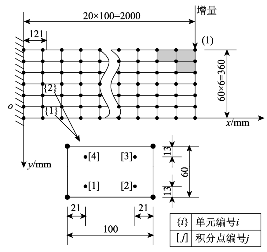 模型II为一个悬臂梁(图4),厚度为10 mm,自由端承受集中力。此悬臂梁采用形函数为二次多项式的四结点面单元进行离散,采用4个高斯点近似计算p{e},详见图4。