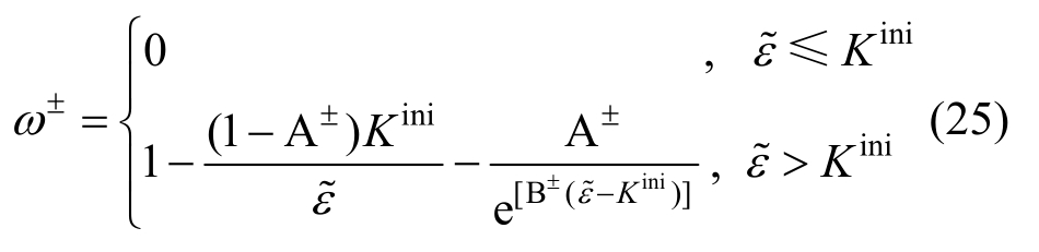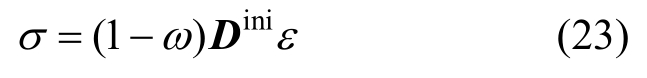 式中:Dini是由弹性模量E、泊松比ν 构造的材料初始刚度矩阵(各向同性);标量ω 是损伤变量。ω 的计算公式为: