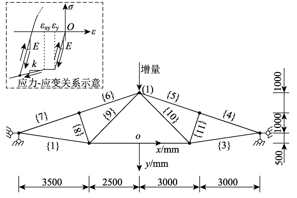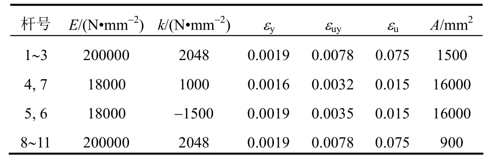 杆号 E/(N•mm-2) k/(N•mm-2) εy εuy εu A/mm2 1~3 200000 2048 0.0019 0.0078 0.0751500 4, 7 18000 1000 0.0016 0.0032 0.01516000 5, 6 18000 -1500 0.0019 0.0035 0.01516000 8~11 200000 2048 0.0019 0.0078 0.075900
