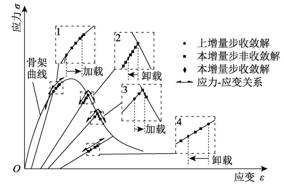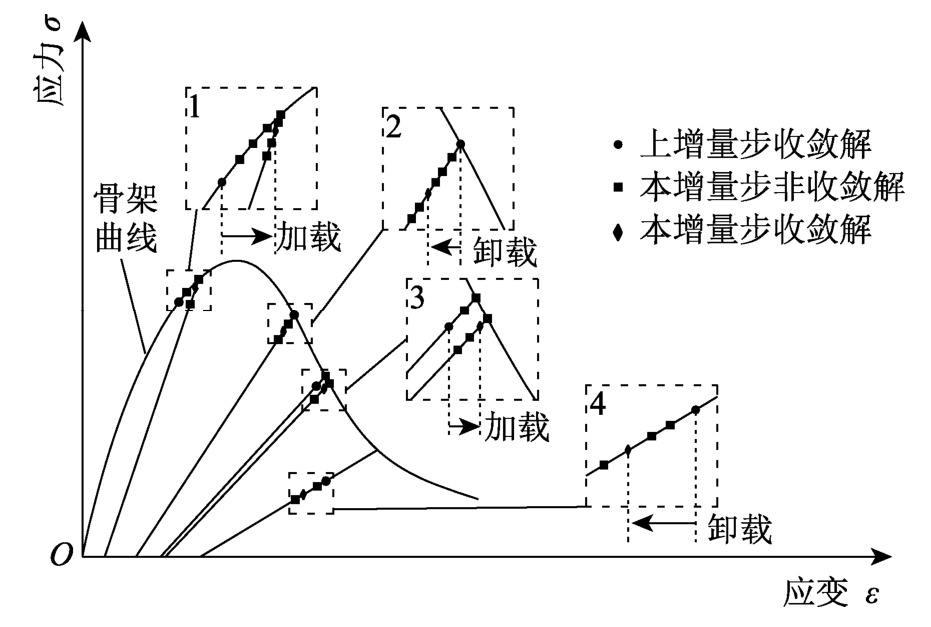常见的工程材料(如混凝土、钢材)为依赖应变历史材料(SHDM),此类材料的正应变增量过程(应变加载)中的切线模量,不同于负应变增量过程(应变卸载)中的切线模量,即材料点应变在加载和卸载(下文简称“应变加卸载”)时具有不同的应力变化规律。当不考虑其他非线性因素时,SHDM结构(SHDM制成的结构)的有限元静力问题是一个材料非线性问题。此静力问题完成求解时,会获得满足静力平衡的荷载-位移曲线(以下简称平衡路径)。平衡路径具有硬化段,但当材料兼具应变软化性质时(如混凝土),它可能还具有极值点、软化段。此静力问题进行求解时:解法一般采用增量迭代法,即总体上采用增量法求解,增量步采用迭代法求解[1];迭代时,为保证收敛解为真实静力解,用以更新单元内高斯积分点(以下简称高斯点)应力的应变须仅经历过加载或卸载。