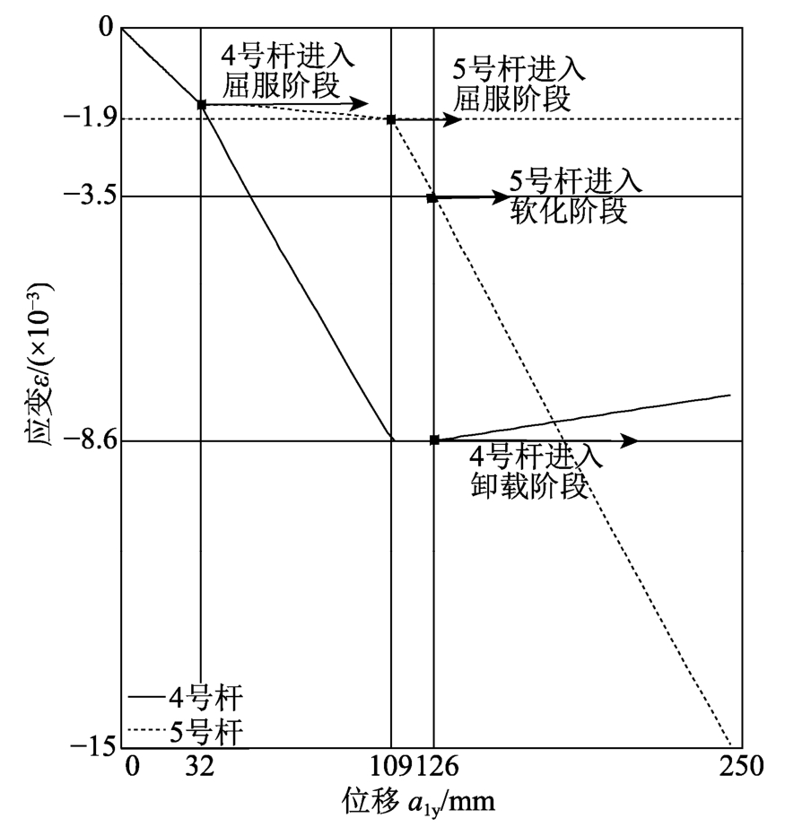 3) 对于模型I,由图7可知(结合表2):4号杆、5号杆的材料性能阶段与相应的平衡路径阶段(图6)相关,如结构的软化阶段始于5号单元的应变软化,且同时伴随着4号杆的应变卸载,此现象即为形变局部化。