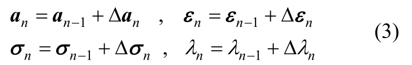 总体上,问题2用荷载或位移增量法求解。求解时,整个平衡路径连续地分解成序列{Rn},其中Rn(n=1,2,…)为第n个增量步。Rn的解为an、状态量Cn、λn。an、Cn中的εn、σn,以及λn可写为: