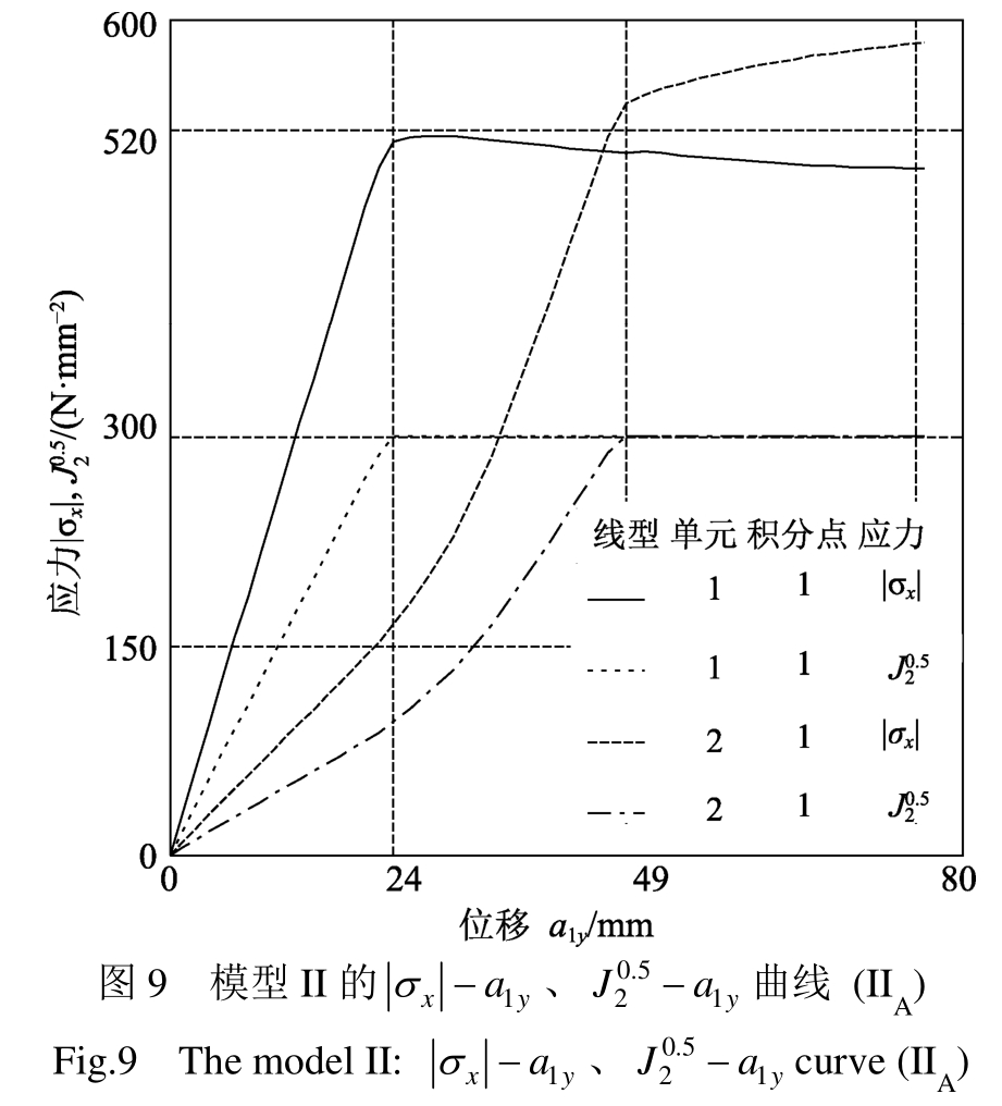 4) 对于模型II,对于x=121 mm处的梁横截面S,假定S应变保持平面,则由材料力学公式得:① 当S仅有最外边缘纤维应力等于fy时(状态e),f1y=59.7 kN;② 当S的所有纤维应力等于fy时(状态p),f1y=89.6 kN。依据图8、图9,并结合图4给出的单元1的1号高斯点、单元2的2号高斯点的y坐标,得:① 当a1y≈24 mm时,S刚越过状态e,此时结构刚度开始降低,f1y≈68.0 kN,此与理论值接近;② 当a1y=49 mm时,S临近状态p,此时结构刚度临近零,f1y ≈92.0 kN,此与理论值接近。