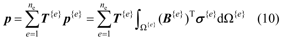 式中:e表示单元编号;ne表示系统内的单元数量;p{e}、B{e}、σ{e}、Ω{e}分别为单元e的内部结点荷载、应变矩阵、应力向量、所占空间;p{e}、B{e}、σ{e}分别为