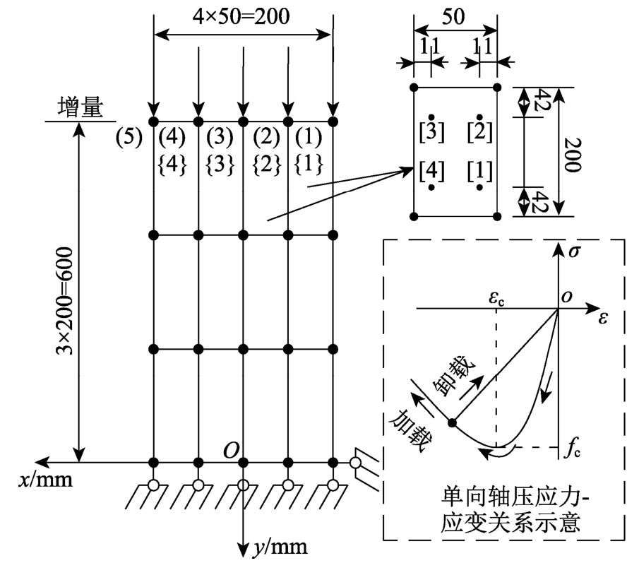 是值依赖于ε 的等效应变,计算式参见文献[33]。本算例中,材料参数为:ν =0.2,E=25500 N·mm-2; A+ =0.95,A-=1.38,B+=11500,B-=2000,Kini= 9.8×10-5;利用上述参数可给出材料的单轴受压应力应变关系(图5为示意图),其中峰值强度fc=24.4 N·mm-2,与fc对应的应变εc=1.75×10-3。