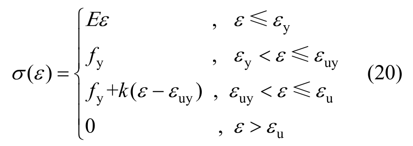 式中:E为弹性模量;εy为屈服应变;fy为屈服应力;k为硬/软化段斜率(当k>0时,为应变硬化;当k=0时,为理想弹塑性,当k<0时,为应变软化);εuy为硬/软化段起点应变;εu为峰值应变。各拉压杆的本构模型参数取值见表2。应力-应变关系的示意图见图3。