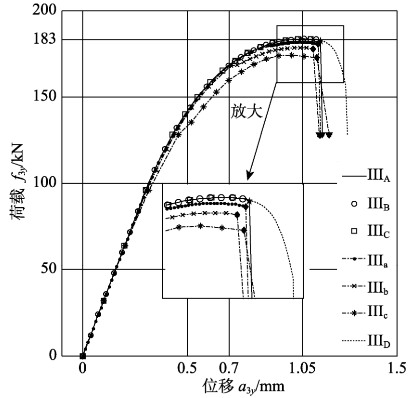 关系曲线。模型III:图10为f3y-a3y关系曲线,其标识了模型III加载的硬化阶段、软化阶段;图11为IIIB、IIID情况下1号、2号单元的εy-a3y的关系曲线。对于图10:图形★标识IIIA的最终一个收敛解(图中未标识临近★的IIIB、IIIC的最终一个收敛解);图形◆标识IIIa、IIIb、IIIc的最终一个收敛解;图形▼标识“增量步迭代终止条件(式(26))满足、但收敛条件(式(6))不满足”的迭代解;图例IIID标示采用解法2和NEIA算得的平衡路径。对于图11:图形●标识最终一个收敛解;图形▲或▼标识“增量步迭代终止条件(式(26))满足、但收敛条件(式(6))不满足”的迭代解。