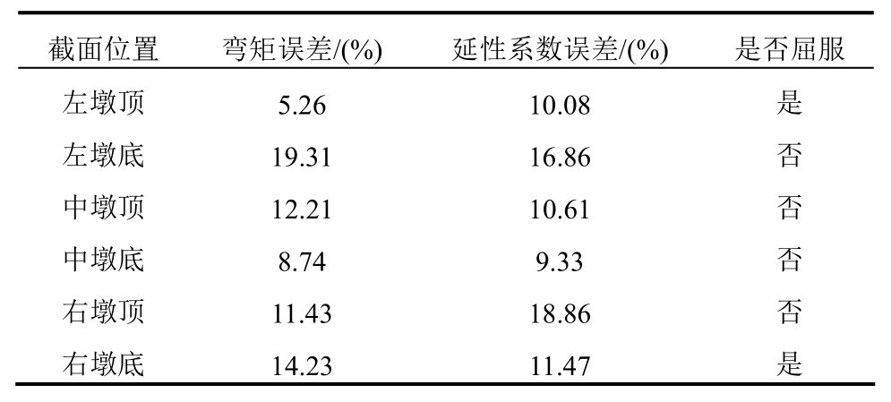截面位置 弯矩误差/(%) 延性系数误差/(%) 是否屈服左墩顶 5.26 10.08 是左墩底 19.31 16.86 否中墩顶 12.21 10.61 否中墩底 8.74 9.33 否右墩顶 11.43 18.86 否右墩底 14.23 11.47 是
