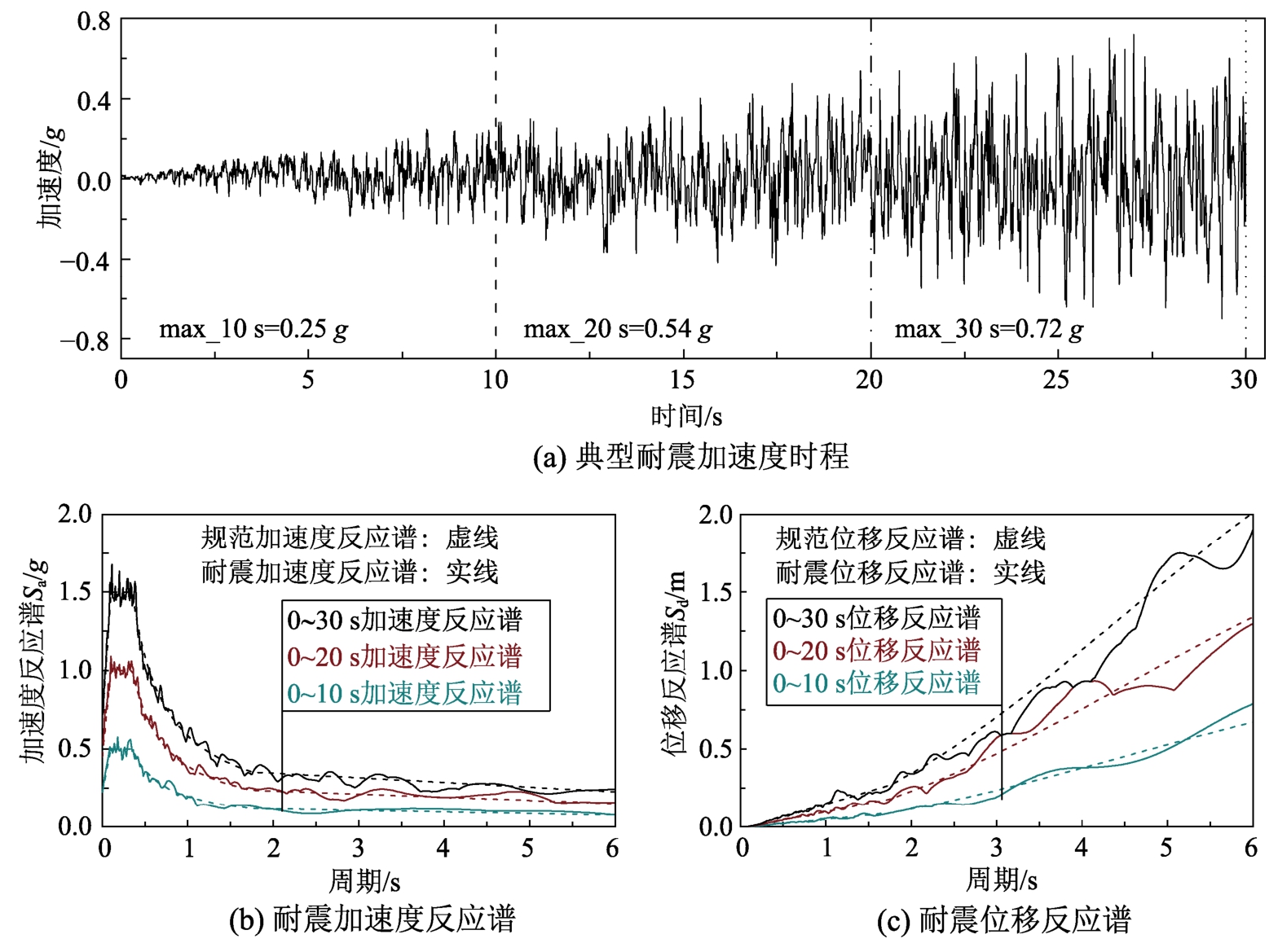 图1给出其中一条耐震时程曲线图以及此耐震曲线在0 s~10 s、0 s ~20 s和0 s ~30 s三个时间段的耐震反应谱,并与三个时间段内的规范反应谱(将目标规范谱谱值分别扩大1倍、2倍和3倍)进行对比。从图1(a)中可以看到耐震时程曲线的峰值随着时间不断增长,在三个时间段内的最大值分别为0.25 g、0.54 g和0.72 g,与耐震时程法的理念一致。此外,如图1(b)所示,合成的耐震时程曲线在三个时间段内的加速度反应谱与规范反应谱均能较好的吻合,表明此条耐震时程曲线满足合成准则。由式(2)可知合成耐震时程曲线是以加速度反应谱为基础,因此上述与规范加速度谱的吻合是基本条件。而本文需采用大刚度法对基础进行位移输入以考虑行波效应[23],因此需进一步观察位移谱的吻合性。图1(c)给出了耐震位移反应谱在三个时间段内与规范位移谱的对比。其中规范位移谱可通过式(3)得到: