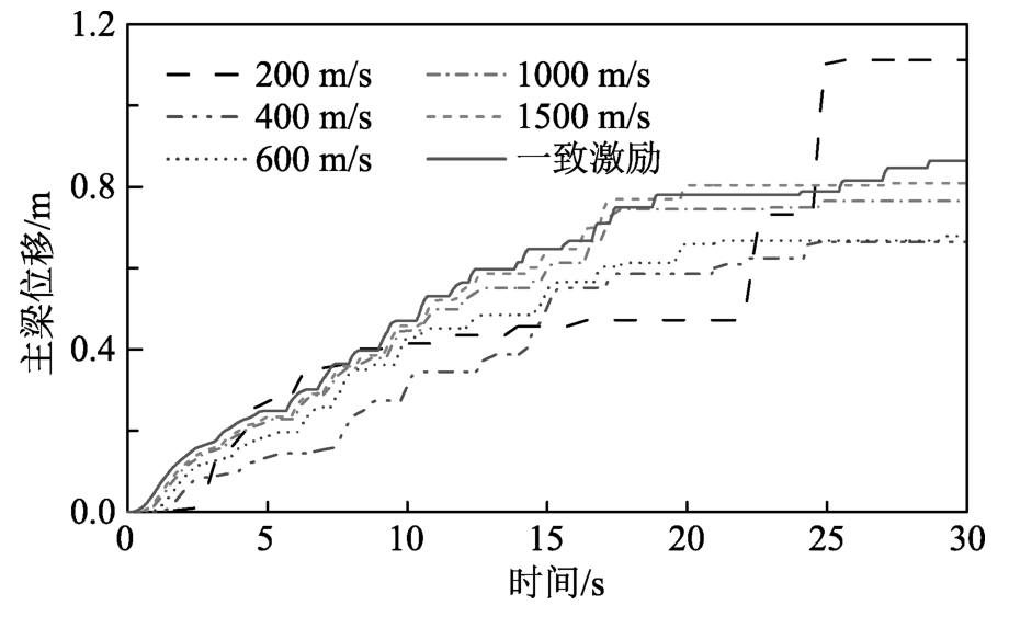 图11给出了不同地震视波速下主梁位移的耐震时程曲线。可以发现当波速大于1000 m/s时,行波效应对主梁位移的影响可忽略;而当波速小于1000 m/s时,主梁位移明显小于一致激励下的响应,这是因主梁两侧的碰撞力对主梁运动起约束作用。但在视波速为200 m/s时的大震下(大于25 s),因巨大碰撞力且多数桥墩进入塑性,主梁位移从0.73 m迅速增大到1.11 m。由此可见,即使碰撞单元和行波效应等复杂边界和输入条件能减小大跨度矮塔斜拉桥主梁地震响应,但因结构自身进入非线性,可能使上述有利作用转变为不利影响。