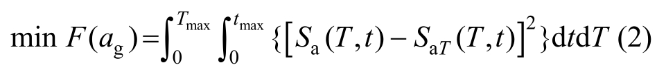 式中:ag为合成的耐震加速度时程曲线;F(ag)为目标耐震方程;Sa(T,t)为0~t时段内的耐震加速度反应谱;Tmax和tmax分别为优化时的反应谱最大周期和耐震加速度最大持时。此优化方程通过不断迭代得到一条最优地震动ag,使该地震动在任意时刻的反应谱和目标谱能最大程度吻合。