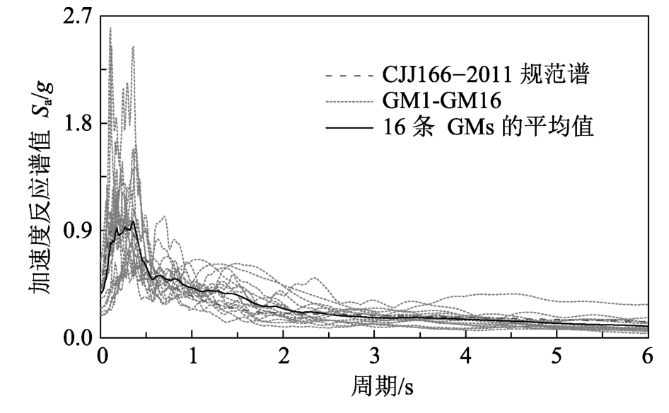 对于IDA方法,首先以合成耐震时程曲线的规范反应谱为目标谱,在PEER-NGA强震数据库中挑选16条天然地震动。挑选原则是调幅后的16条地震动加速度反应谱均值与规范反应谱具有较小的离散性。图5给出16条调幅后的地震动加速度反应谱均值和规范谱的对比。从图5可以看出天然地震动反应谱均值和规范反应谱曲线能较好地吻合。对调幅后的天然加速度时程和合成的三条耐震时程进行两次积分得到位移时程,并做基线修正处理以消除零位漂移误差。此外,因碰撞的瞬时性,需将位移输入的时间间隔线性插值为0.001 s。