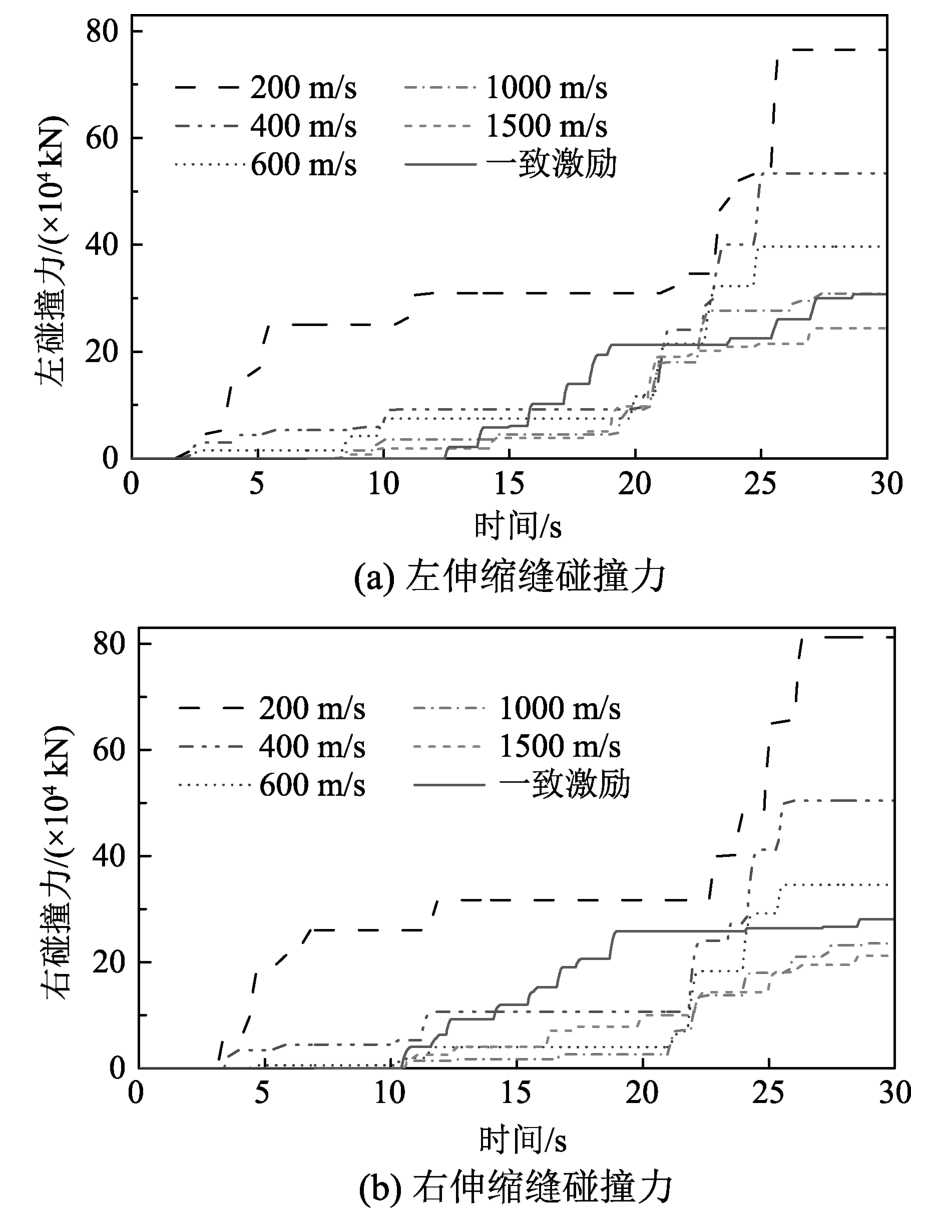 基于3.3节耐震时程法适用性验证可知,其是一种仅需少量分析便可解决地震动视波速对大跨度桥梁碰撞影响问题的潜在方法。因此,使用此方法进行不同地震动视波速对大跨度矮塔斜拉桥碰撞响应影响的分析。