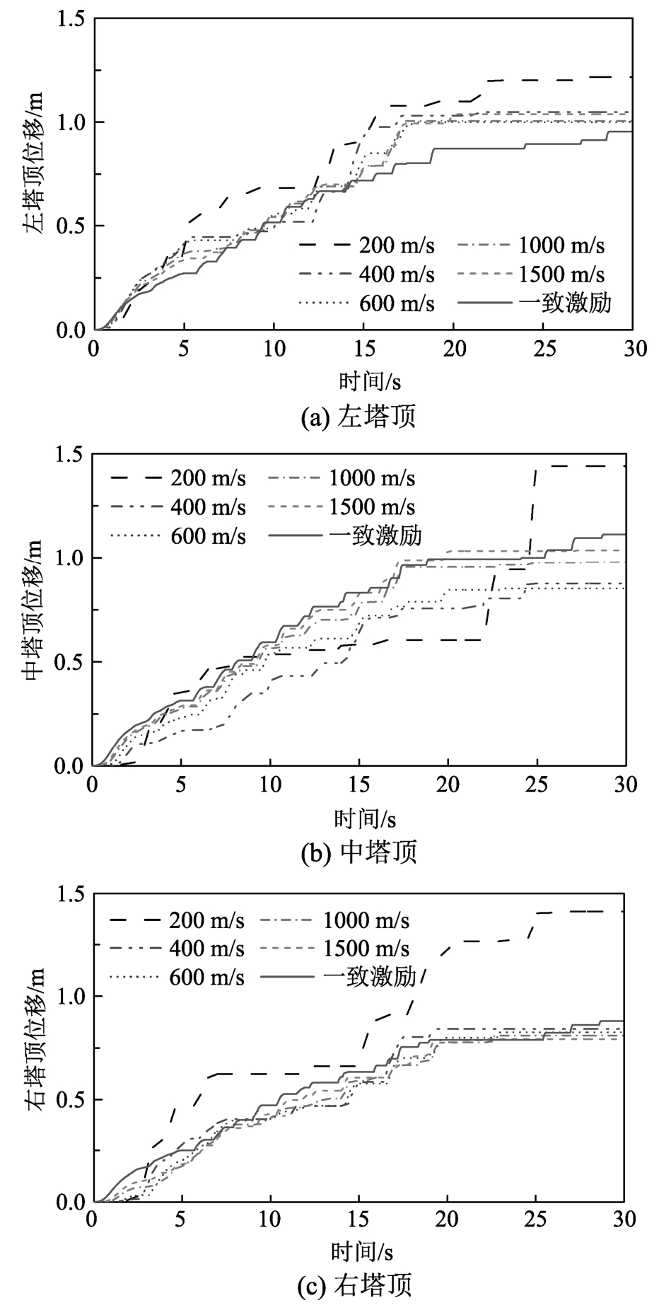 图12给出了主梁上部三座索塔顶部位移在不同地震动视波速下的ETA分析图,可以发现视波速对三座索塔顶位移的影响存在差异。从图12(a)表达的左塔顶位移耐震图看出15 s前(200 m/s视波速为5 s前),行波效应对于塔顶位移的影响很小,曲线几乎重合;但随着地震动强度的增大,视波速增大左塔顶位移的现象逐渐明显,且增大幅度与视波速大小无关,但需注意的是当视波速继续增大到一定程度时,大震下增大左塔顶位移现象会逐渐减弱,最后与一致激励下的左塔顶位移保持一致。而视波速对于中塔顶位移的影响与主梁位移相似,如图12(b)所示,即总体上行波效应起抑制位移作用,但大震时的200 m/s视波速下出现位移增大现象。此外,由图12(c)可知,波速大于200 m/s时的行波效应对右塔顶位移影响很小,但波速为200 m/s时需要考虑行波效应增大位移响应的不利影响。结合塔顶和上述主梁位移在不同视波速下的ETA分析可知,对于软土地质(视波速一般小于200 m/s),需考虑地震动行波效应带来的位移增大现象,且右索塔受其影响最大。