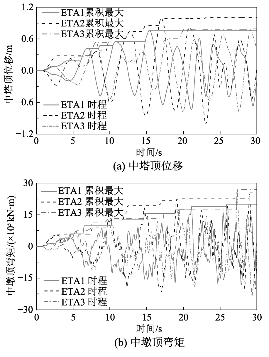 Fig.4 Top displacement of the middle tower and top bending moment of the middle pier under ET accelerograms
