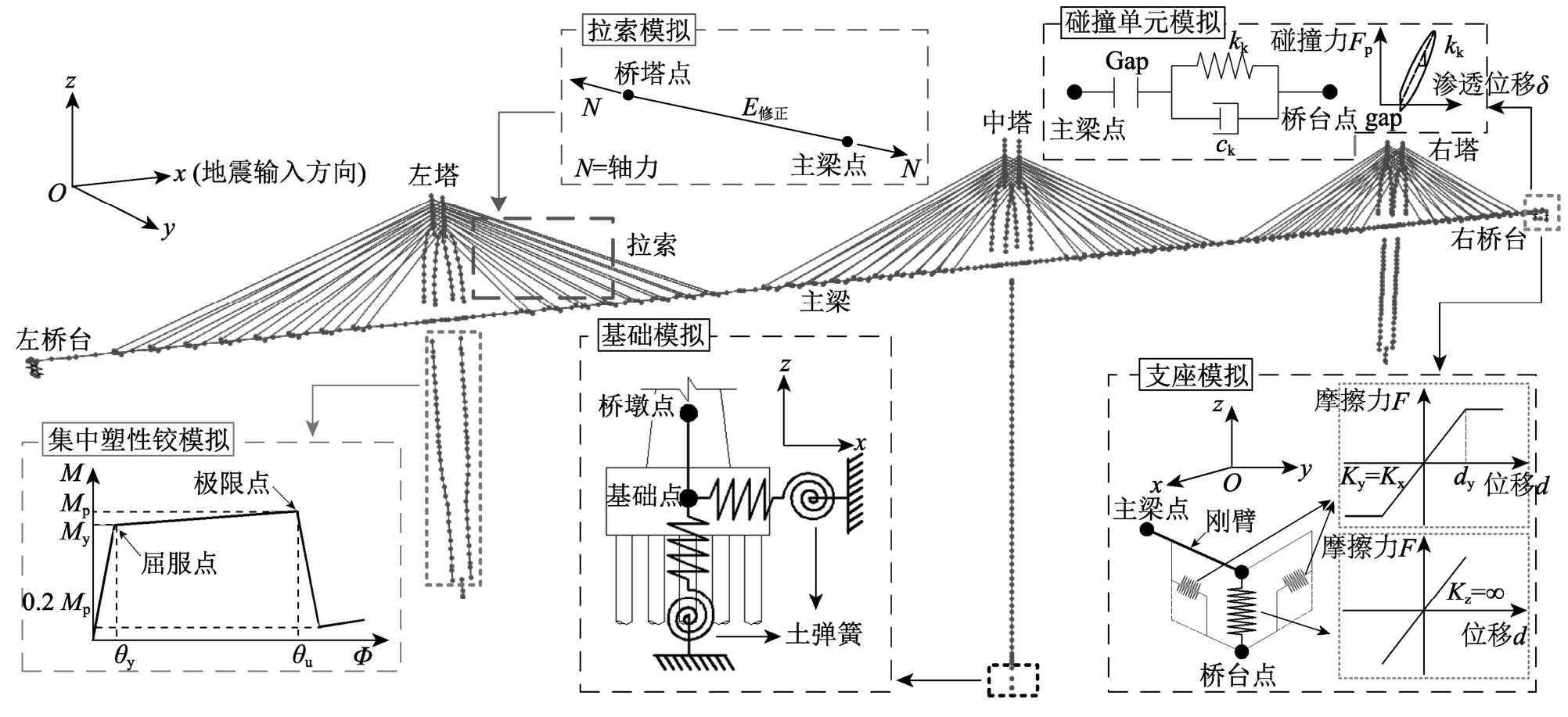 基于Sap2000分析软件建立了考虑主梁与桥台碰撞和桩-土相互作用影响的三维非线性有限元模型,如图3所示,其中桥梁纵向为x轴方向。主梁在地震时假设仍保持为弹性[20],因此采用弹性模量3.55×104 MPa的三维弹性梁单元进行模拟,除承受自重外,主梁上还需考虑横隔板质量和二期恒载。依据文献[24]的多塔矮塔斜拉桥振动台试验结果可发现,主梁上部塔柱在地震下并未出现裂纹和破坏,因此同样采用弹性梁单元模拟,弹性模量取为3.60×104 MPa。考虑到墩柱在地震作用下易遭受损伤,因此对有限元模型的墩柱采用集中塑性单元用于考虑非线性的影响[25-26];图3左下部给出塑性区域的典型弯矩-转角示意图,其中屈服点和极限点性能指标依据各截面尺寸和配筋而定,超过极限发生破坏后,截面承载能力降至极限能力的20%[25]。斜拉索采用桁架单元模拟,弹性模量为1.95×105 MPa,同时采用Ernst[27]提出的弹性模型修正公式考虑拉索的垂度效应。此外,通过在单元中以P-Δ力的形式施加恒载轴力用于考虑桥塔、墩柱和斜拉索的几何非线性。为真实模拟出原桥结构的边界条件,如图3中下部所示,采用承台底施加六个方向的弹簧来模拟土与桩基的相互作用,弹簧的平动和转动刚度依据土层状况和桩的布置形式按静力等效原则确定。因重力式桥台埋置于坚硬岩层中,所以采用与场地固结约束模拟。桥台与主梁间的球形钢支座纵横向均采用双线性理想弹塑性弹簧单元模拟,其中初始滑动位移dy取2 mm;为确保支座在地震下不出现脱空现象,竖向刚度取值为无穷大。当主梁和桥台间伸缩缝间隙无法满足主梁位移响应时会发生碰撞,本研究采用考虑碰撞过程中能量损失的Kelvin碰撞单元模拟此现象[28],其示意图见图3右上部分,碰撞过程中的碰撞力Fp可由式(4)表示: