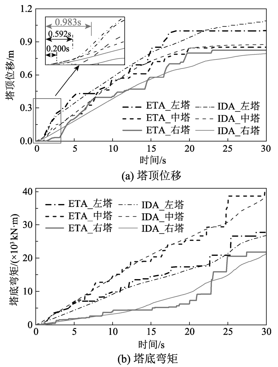 Fig.6 Comparison of responses of the bridge towers between IDA and ETA