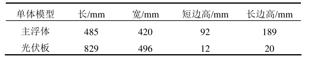 单体模型 长/mm 宽/mm 短边高/mm 长边高/mm主浮体 485 420 92 189光伏板 829 496 12 20