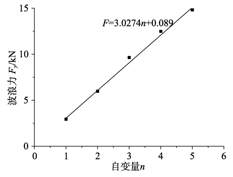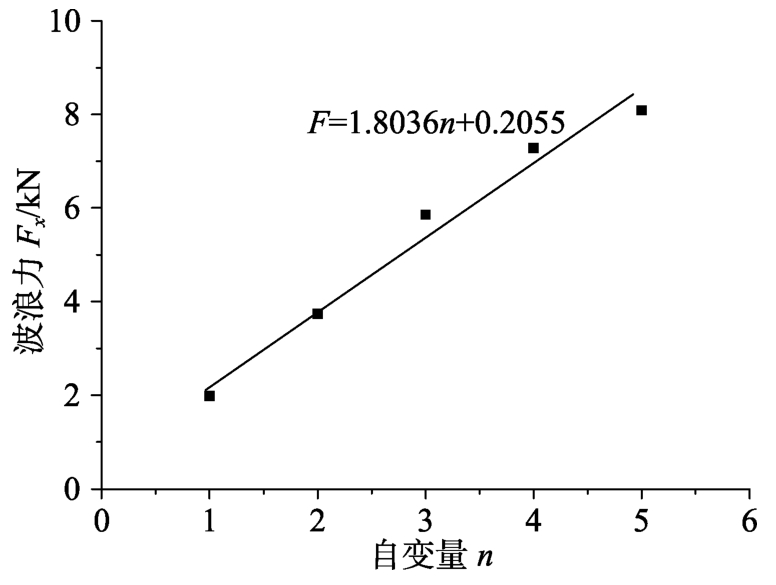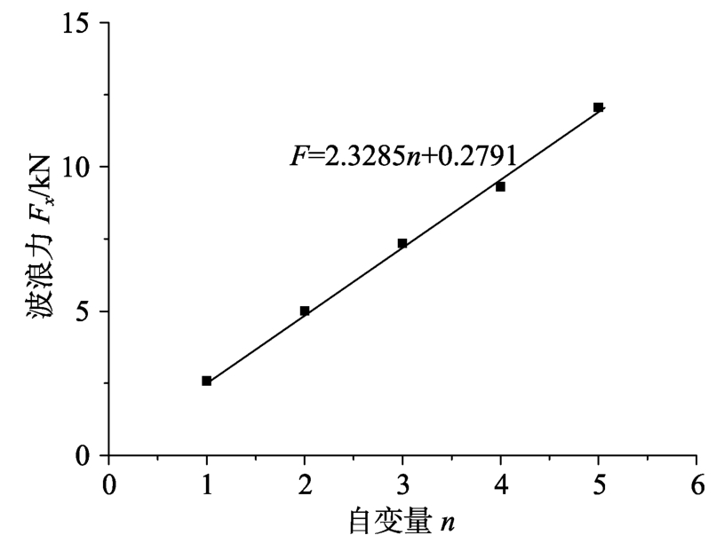 由上述研究的波浪载荷随行列的变化规律可知,定义自变量n,规定5×4方阵的自变量为1,则波浪载荷Fx和Fy与自变量n成线性关系,方阵5×4、10×8、15×12、20×16、25×20和120×96对应的自变量分别为1、2、3、4、5和24。采用以下方法来计算120×96方阵在单位波幅条件下所受的波浪载荷:根据5×4、10×8、15×12、20×16、25×20方阵在0°、45°和90°浪向所受最大波浪载荷来推算出的公式来计算120×96方阵所受的波浪载荷。