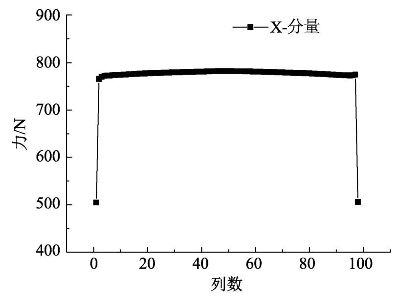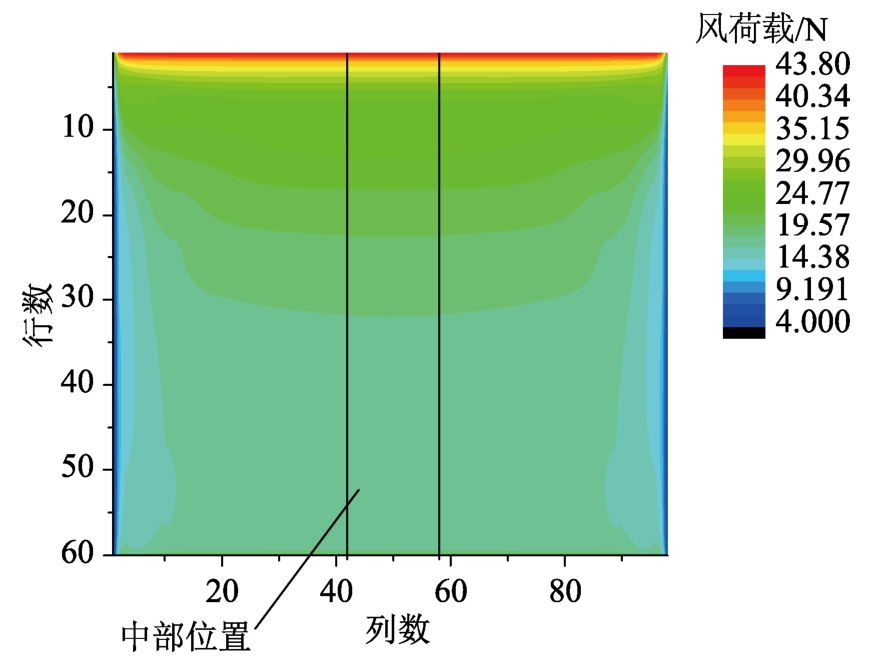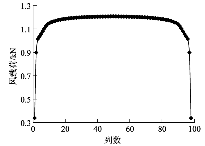 图10为北风时方阵中风载荷分布云图,从图10可以直观感受到风载荷由迎风位置到末端的衰减趋势,并且,在中部位置风载荷沿行数的变化规律一致。为更直观分析此规律,将方阵中每一列单元的载荷进行累加,命名为列风载荷,绘制列风载荷分布曲线如图11所示。列风载荷分布曲线基本呈现对称形状,其中中间大部分区域数值接近,曲线平缓,两边缘处受力逐渐减小。