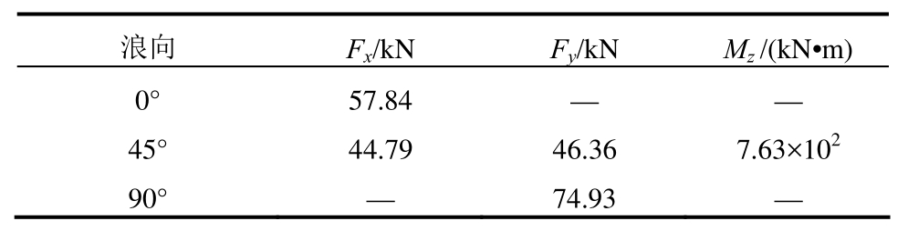 浪向 Fx/kN Fy/kN Mz /(kN•m)0° 57.84 — —45° 44.79 46.36 7.63×102 90° — 74.93 —