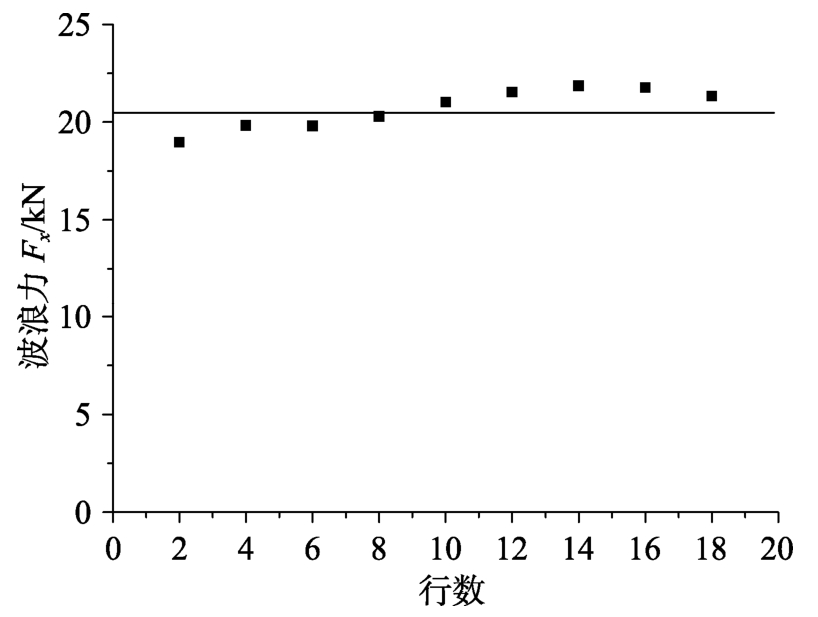 由图21可知,随着行数的增加,整体方阵所受波浪力的合力在21 kN附近震荡,整体方阵所受波浪力的合力几乎不再变化;由图22可知,整体方阵所受波浪力的合力随方阵的列数呈线性增加。