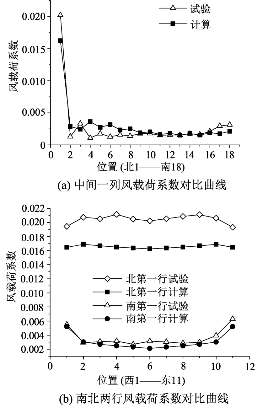 图15(b)为南北两行的风载荷系数对比结果,北第一行两条曲线的偏差已在图15(a)中有所反映,该曲线显示出这种偏差在迎风的第一行是共性的;南第一行的两条曲线则更为接近。同时,图中曲线反映的方阵载荷沿东西向的分布与初步计算的结果是一致的,即载荷分布东西向对称,中间大部分区域载荷基本一致,两边缘略有不同。