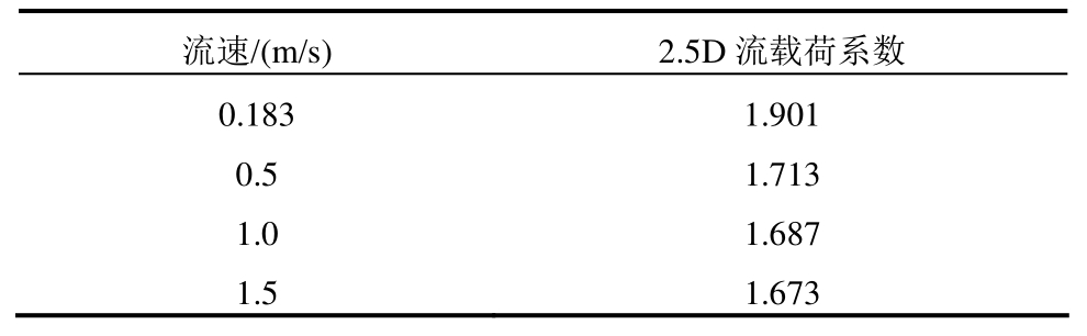 不同流速下的2.5 D流载荷系数变化基本平稳,仅在0.183 m/s的低流速下受到摩擦阻力特性的影响,流载荷系数稍有增大。不过,此时流载荷数值上是小量,对工程问题的研判影响不大。因此,流速大于0.5 m/s即可认为流载荷与流速平方成正比,流速较低时,适当提高流载荷系数也可快速预报流载荷。