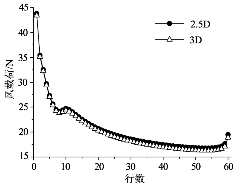采用与上述试验工况计算一致的数值求解方法及网格划分形式对2.5 D工况进行高精度计算。计算后的2.5 D整体风载荷系数为5.103,与实体方阵简略计算得到的中间第50列风载荷系数9.386做比,得到0.547的比例系数。假定高精度计算和实体方阵简略计算得到的载荷分布规律类似,用2.5 D计算得到的比例系数对简略计算的结果进行修正,即可得到较为准确的整体方阵风载荷数值结果。