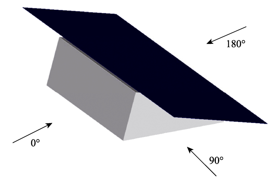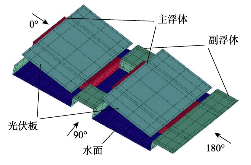 为验证CFD计算的准确性,进行了单体简化光伏板+主浮体模块的模型试验,并与单体简化模型计算结果进行对比。单体模型按照1∶2的缩尺比进行制作,基本尺寸见表1,模型示意图及试验风向如图6所示。