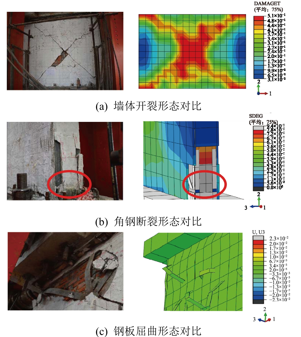 图8给出了加固砌体墙数值模拟与试验墙体主要破坏形态对比情况。由图8可知数值模型能够模拟出正交加固墙和斜撑加固墙的三阶段破坏特征: