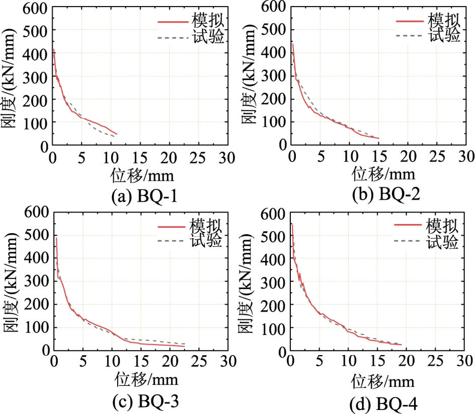 图9、图10和图11给出了不同砂浆强度下正交加固墙体滞回曲线、骨架曲线、刚度退化曲线模拟与试验结果的比较曲线。从图9~图11可以看出,本文数值模拟得到的滞回环、骨架曲线以及刚度退化曲线与试验结果基本一致。其中,对于BQ-3模型,下降段范围内数值模拟所得曲线与试验相应曲线相差较大,主要是荷载进入下降段后测试墙顶的位移计超量程进行更换导致的试验误差引起的。