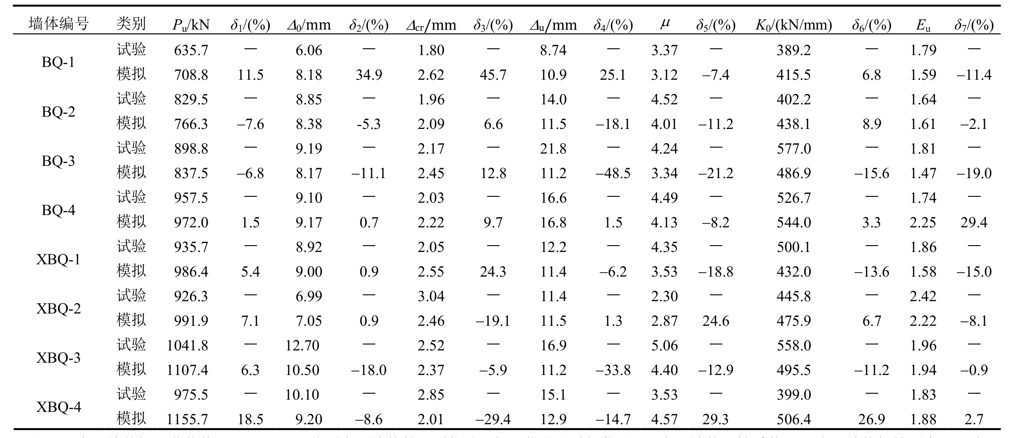 墙体编号 类别 Pu/kN δ1/(%) Δ0/mm δ2/(%) Δcr/mm δ3/(%) Δu/mm δ4/(%) μ δ5/(%) K0/(kN/mm) δ6/(%) Eu δ7/(%)BQ-1 模拟 708.8 11.5 8.18 34.9 2.62 45.7 10.9 25.1 3.12 -7.4 415.5 6.8 1.59 -11.4试验 829.5 — 8.85 — 1.96 — 14.0 — 4.52 — 402.2 — 1.64 —BQ-2 模拟 766.3 -7.6 8.38 -5.3 2.09 6.6 11.5 -18.1 4.01 -11.2 438.1 8.9 1.61 -2.1试验 898.8 — 9.19 — 2.17 — 21.8 — 4.24 — 577.0 — 1.81 —BQ-3 模拟 837.5 -6.8 8.17 -11.1 2.45 12.8 11.2 -48.5 3.34 -21.2 486.9 -15.6 1.47 -19.0试验 957.5 — 9.10 — 2.03 — 16.6 — 4.49 — 526.7 — 1.74 —BQ-4 模拟 972.0 1.5 9.17 0.7 2.22 9.7 16.8 1.5 4.13 -8.2 544.0 3.3 2.25 29.4试验 935.7 — 8.92 — 2.05 — 12.2 — 4.35 — 500.1 — 1.86 —XBQ-1 模拟 986.4 5.4 9.00 0.9 2.55 24.3 11.4 -6.2 3.53 -18.8 432.0 -13.6 1.58 -15.0试验 926.3 — 6.99 — 3.04 — 11.4 — 2.30 — 445.8 — 2.42 —XBQ-2 模拟 991.9 7.1 7.05 0.9 2.46 -19.1 11.5 1.3 2.87 24.6 475.9 6.7 2.22 -8.1试验 1041.8 — 12.70 — 2.52 — 16.9 — 5.06 — 558.0 — 1.96 —XBQ-3 模拟 1107.4 6.3 10.50 -18.0 2.37 -5.9 11.2 -33.8 4.40 -12.9 495.5 -11.2 1.94 -0.9试验 975.5 — 10.10 — 2.85 — 15.1 — 3.53 — 399.0 — 1.83 —试验 635.7 — 6.06 — 1.80 — 8.74 — 3.37 — 389.2 — 1.79 —XBQ-4 模拟 1155.7 18.5 9.20 -8.6 2.01 -29.4 12.9 -14.7 4.57 29.3 506.4 26.9 1.88 2.7