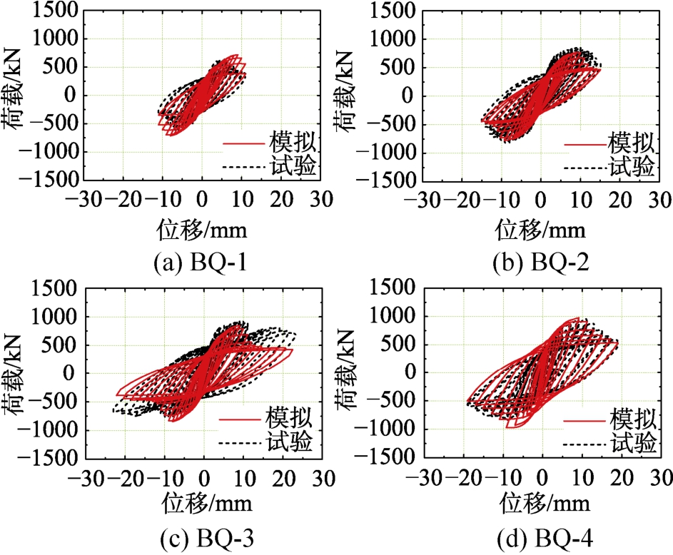 图9 正交加固墙数值模拟与实际试验滞回对比曲线Fig.9 Comparison of hysteresis curves between numerical simulation and actual test of orthogonally reinforced walls