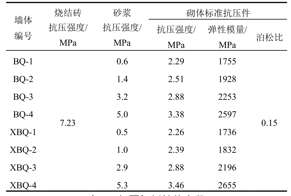 墙体编号砌体标准抗压件烧结砖抗压强度/MPa砂浆抗压强度/MPa抗压强度/MPa弹性模量/MPa 泊松比BQ-1 0.6 2.29 1755 BQ-2 1.4 2.51 1928 BQ-3 3.2 2.88 2253 BQ-4 5.0 3.38 2597 7.23 0.15 XBQ-1 0.5 2.26 1736 XBQ-2 1.0 2.39 1832 XBQ-3 2.9 2.88 2196 XBQ-45.3 3.46 2655