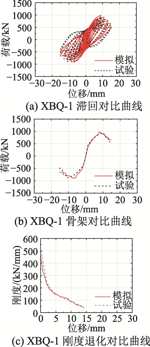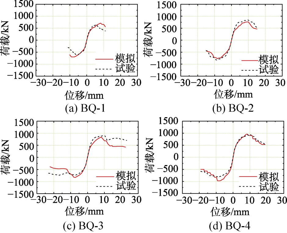 由表5可知,抗剪承载力和峰值位移两项指标的模拟效果最佳,相对误差绝对值的平均值分别为7.9%和8.6%。其中BQ-1和XBQ-4误差稍大,分别为11.5%和18.5%。能量耗散系数和初始刚度两项指标的相对误差绝对值的平均值分别为10.6%和12.0%。延性系数、极限位移和开裂位移的模拟相对误差绝对值的平均分别为 13.9%、13.9%和16.2%。注意到误差最大的指标位于 BQ-1开裂位移、BQ-3极限位移和 XBQ-3极限位移,分别达34.9%、-48.5%和-33.8%。分析位移相对误差较大的可能原因有两点:一是试件开裂时刻的视觉判定存在误差;二是试验分级加载制度过程中量测器材捕捉开裂和极限位移会存在滞后性。此外,延性系数又由开裂位移和峰值位移计算得出,这一过程中亦会产生误差累积。
