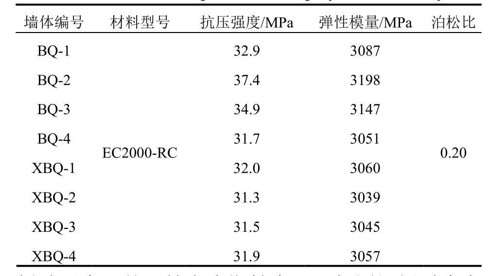 墙体编号 材料型号 抗压强度/MPa 弹性模量/MPa 泊松比BQ-1 32.9 3087 BQ-2 37.4 3198 BQ-3 34.9 3147 BQ-4 31.7 3051 EC2000-RC 0.20 XBQ-1 32.0 3060 XBQ-2 31.3 3039 XBQ-3 31.5 3045 XBQ-431.9 3057