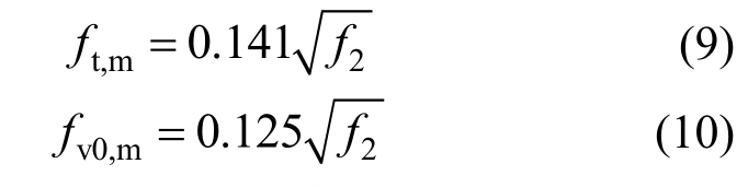 式中:ft,m为砌体轴心抗拉强度平均值;fv0,m为砌体抗剪强度平均值;f2为砌筑砂浆抗压强度平均值。