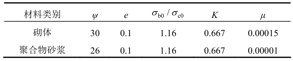 砌体和聚合物砂浆面层为基于混凝土塑性损伤模型(CDP)建立,包含屈服函数、流动准则和本构关系三部分。其中前两部分需要指定屈服函数和D-P流动准则中偏平面上的剪胀角ψ、偏心率e、双轴受压强度与单轴受压强度比σ b 0 /σc0、拉压子午线上第二应力不变量的比值K和材料粘滞系数μ等。粘滞系数主要影响计算收敛性与计算精度,取值不宜过大。上述各参数取值参见表1。